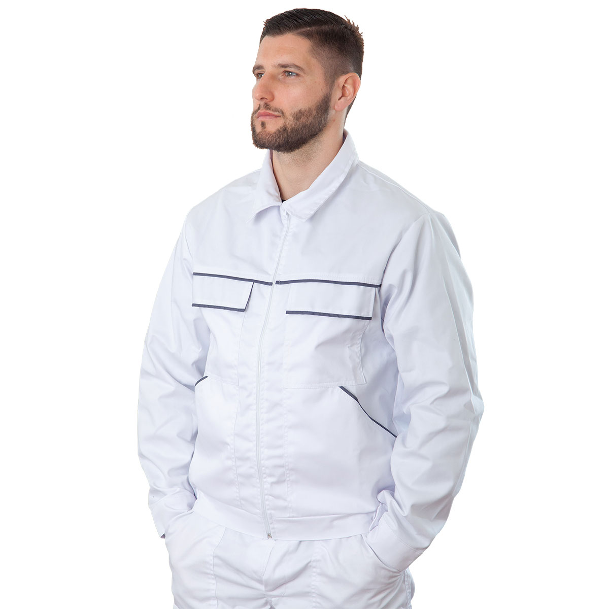 Model sa paspulima u drugoj boji• obična kragna • zakopčavanje pomoću patent zatvarača u boji paspula, bez šob lajsne • leđa iz jednog komada • prednjice iz dva dijela, presjek iznad džepova • poluelastičan pojas • neelastične manžetne podešenje pomoću čičak trake • dva gornja našivene džepa sa patnom i paspulima • dva našivene otvorena džepa dole sa paspulom na otvoru