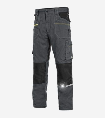 Muške radne pantalone, rastezljiva tkanina koja omogućava slobodno kretanje, struk sa omčama za kaiš, prednji džepovi sa džepom na patent zatvarač, multifunkcionalni džepovi sa obe strane, koljena ojačana kordurom sa otvorom za štitnike za koljena, , reflektirajući dodaci.