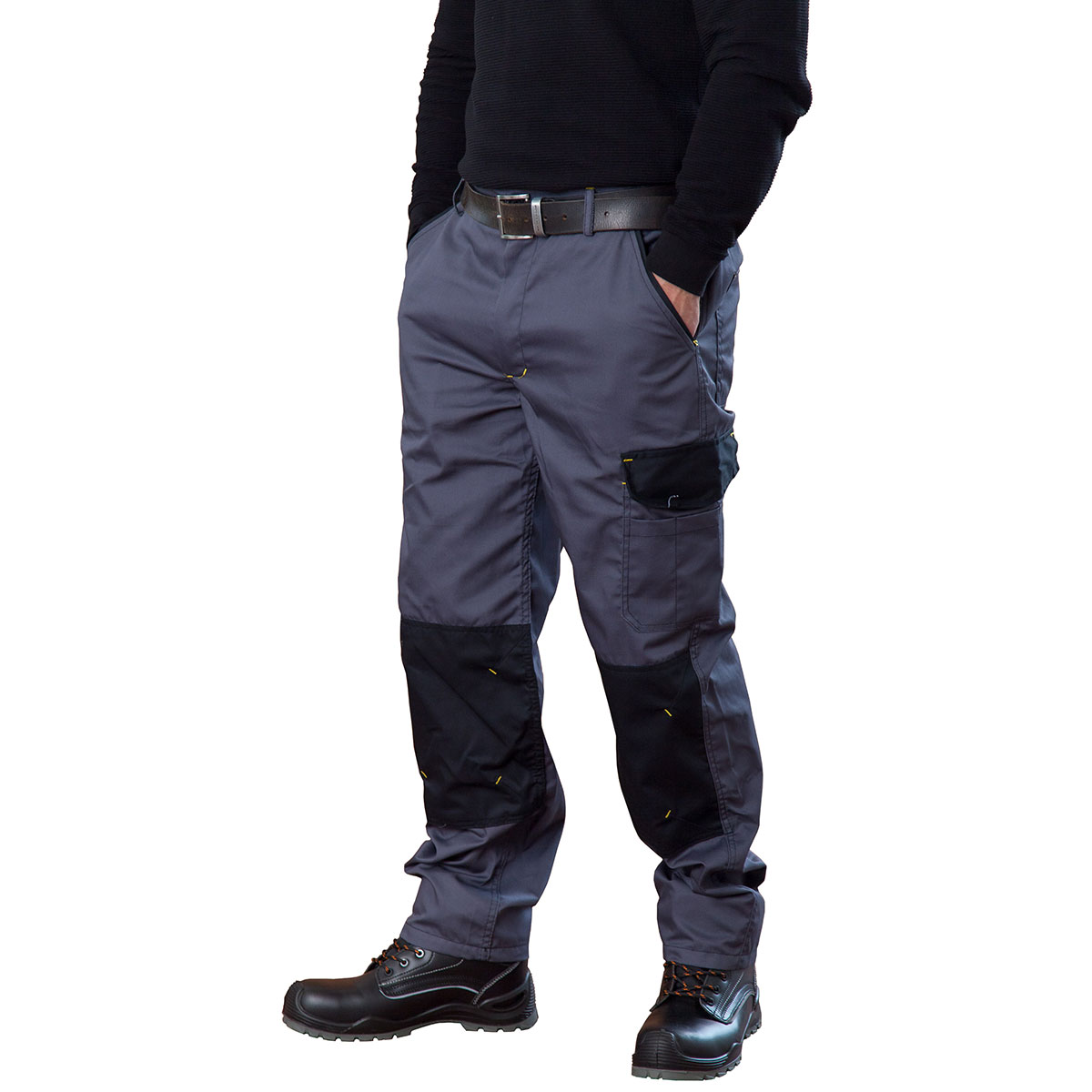 Hlače modernog kroja sa ojačanjem na koljenima sa mogućnošću umetanja štitnika na koljenima • elastičan pojas sa gajkama za opasač • dva prednja džepa • 2 bočna džepa (džep na džepu) na lijevoj strani • 2 metar džepa (džep na džepu) na desnoj strani • 2 zadnja džepa sa patnama; Veličine: 46-64; Boja: Tamno siva – crna