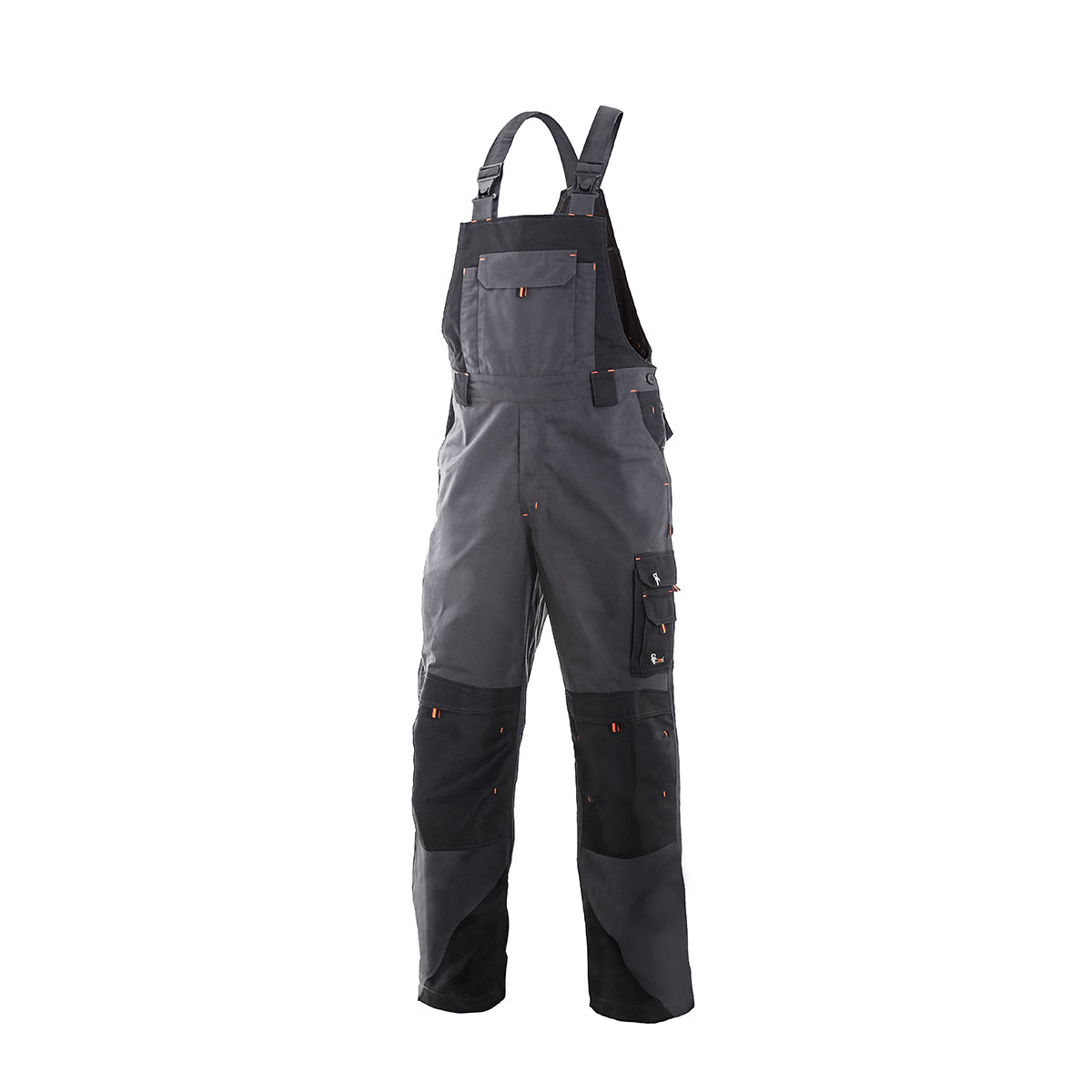 Muške radne hlače s naramenicama • grudni džep sa patnom • pojas sa omčama za kaiš • džepovi naprijed • multifunkcionalni džepovi sa strana • ojačanja na koljenima od 600D poliestera sa otvorima za štitnike za koljena • dva džepa nazad sa patnom • donji dio nogavice ojačan poliesterom 600D • elastična traka na leđima