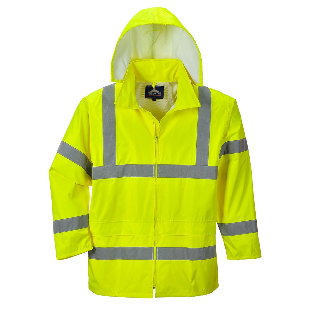 Vrlo prakticna i vodootporna Hi-Vis jakna za rad pri lošim vremenskim uslovima dizajnirana bi korisnika održala vidljivim, sigurnim i suhim u lošim vremenskim uvjetima. Izrađena je od iznimno vodootporne tkanine sa odgovarajućim REACH PVC premazom i ljepljenim šavovima kako bi se spriječilo prodiranje vode. Tkanina je UPF 40+ rangirana i blokira 98% UV zraka. Mnoštvo detalja čini jaknu msigurnom, praktičnom i ugodnom za rad: podesiva kapuljača i porub za dodatnu sigurnost i udobnost, Traka s bio motion uzorkom, za lakše prepoznavanja ljudskog obličja na udaljenosti, Otvori za dodatnu prozračnost i udobnost, Unutarnja elastična manžeta, 2 džepa za sigurnu pohranu. Ovaj se odjevni predmet lako može složiti i spremiti kada nije u upotrebi. Savršeno se kombinira s hlačama za kišu visoke vidljivosti H441.