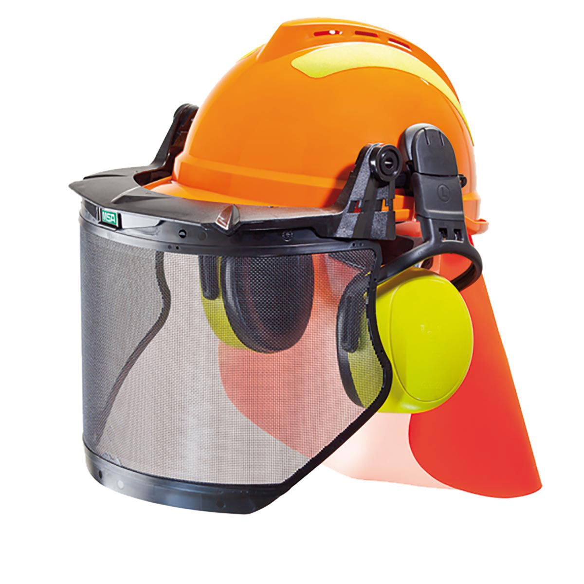 Komplet zaštitne opreme namjenjen za rad u šumarskoj industiji, obranja stabala i podrezivanje.Sve u jednom prikladnom setu: narandžasti šljem, nosač vizira, metalni mrežasti vizir, antifoni. U Premium setu dodta je PVC zaštita brade, verzija visoke vidljivosti sa reflektirajućim naljepnica, vizir oblikom prilagođen antifonima, pokrivanje cijelog lica • Vidljivost kroz mrežu >76%, mogućnost uklanjanja štitinika brade, Robustan okvir za zaštitu od udara opuštenog lanca motorne pile.
