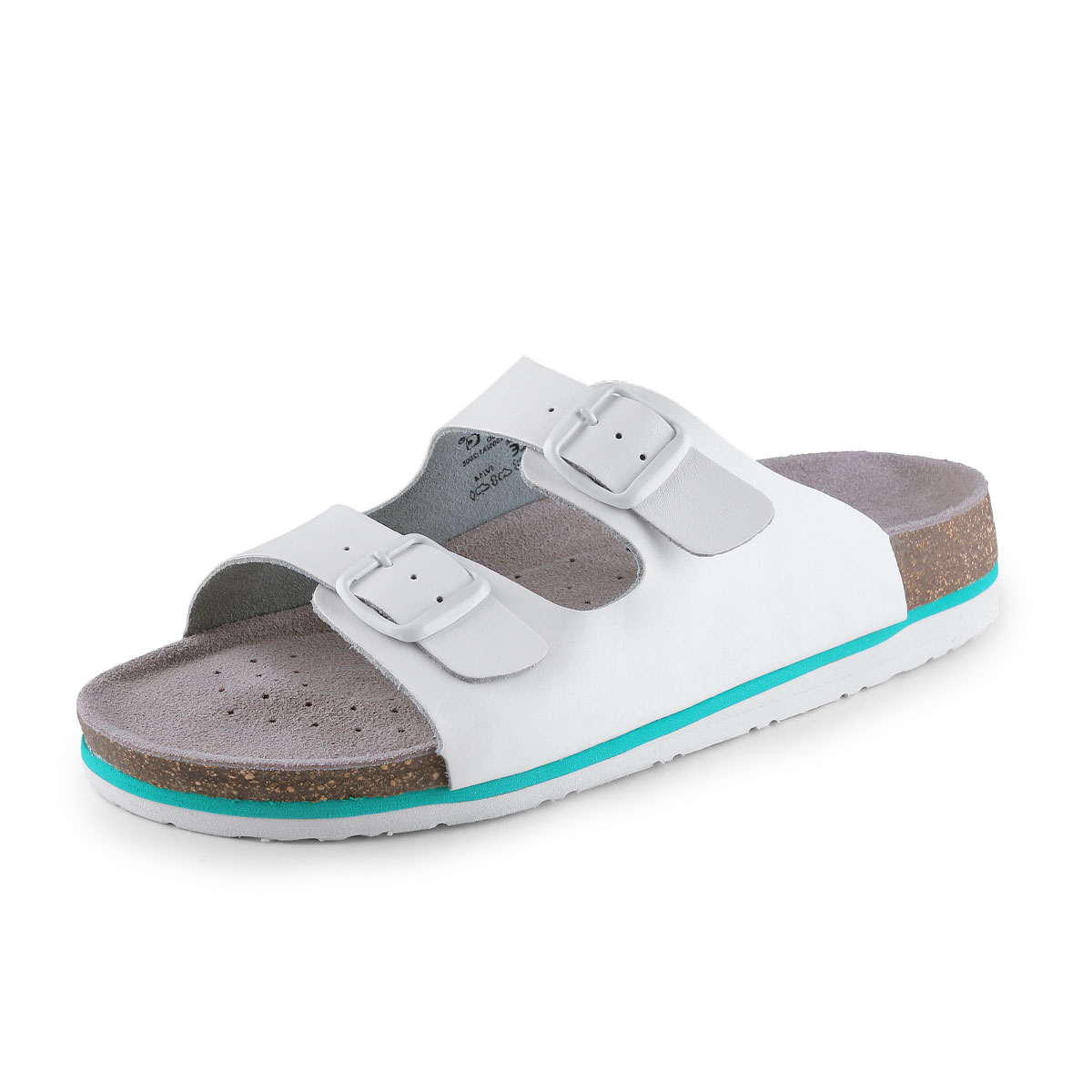 Sandale, žemnski model, sa dvije trake na stopalu i kopčom. Viši potplat, uložak od perforirane goveđe kože, zaštita od proklizavanja, aprorber energije u predjelu pete