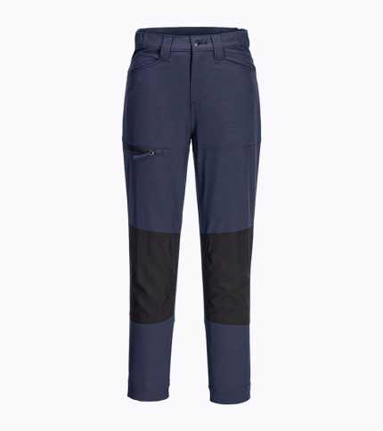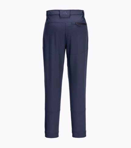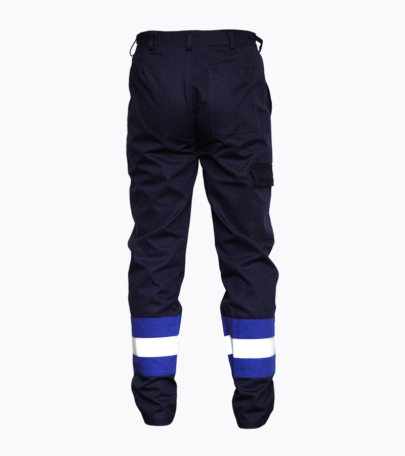 Zakopčavanje na patent zatvaračem,poluelastični pojas, 2 prednja kosa džepa, jedan metarski džep i jedan stražnji džep sa patnom.Boja: Tamno plava sa crvenim paspulima. Veličina: 46-64