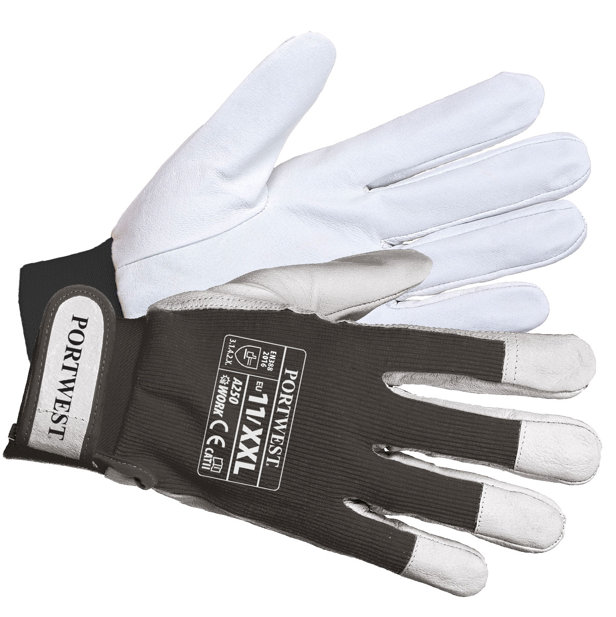 Izdržljiva rukavica od kozje kože s trakom za pričvršćivanje, pamučnom nadlanicom i ojačanim prstima. Pogodna za upotrebu u lakoj industriji. pojedinačno pakovanje
