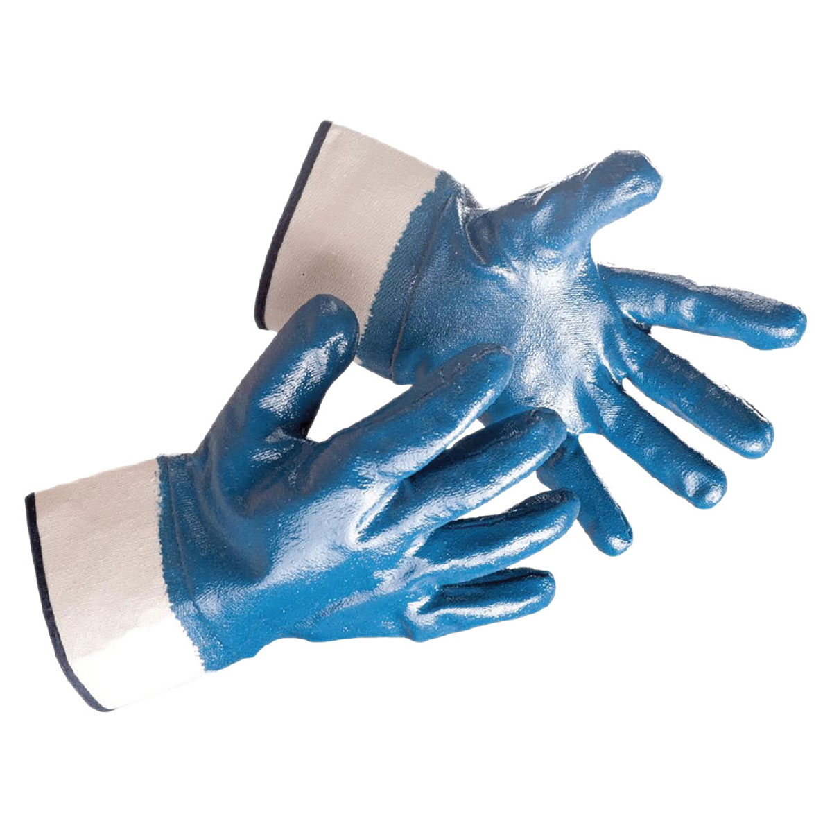 Radne rukavice sa širokom manžetnom, izrađene na pamučnoj osnovi, i kopletna osim manžetne presvučena plavim nitrilom. Primjena: građevinska industrija, mašinska industrija, hemijska industrija