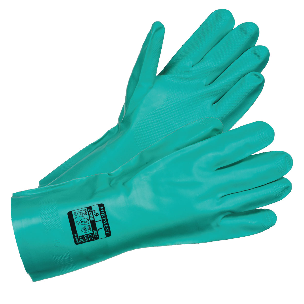 Rukavice otporne na hemikalije sa reljefastom šarom za poboljšan stisak, postavljena pamukom za dodatnu udobnost. Za upotrebu u hemijskoj, naftnoj i prehrambenoj industriji. Dužina 320mm, debljina 0.38mm. Materijal: Nitril, pamuk; Veličine: 7-11;